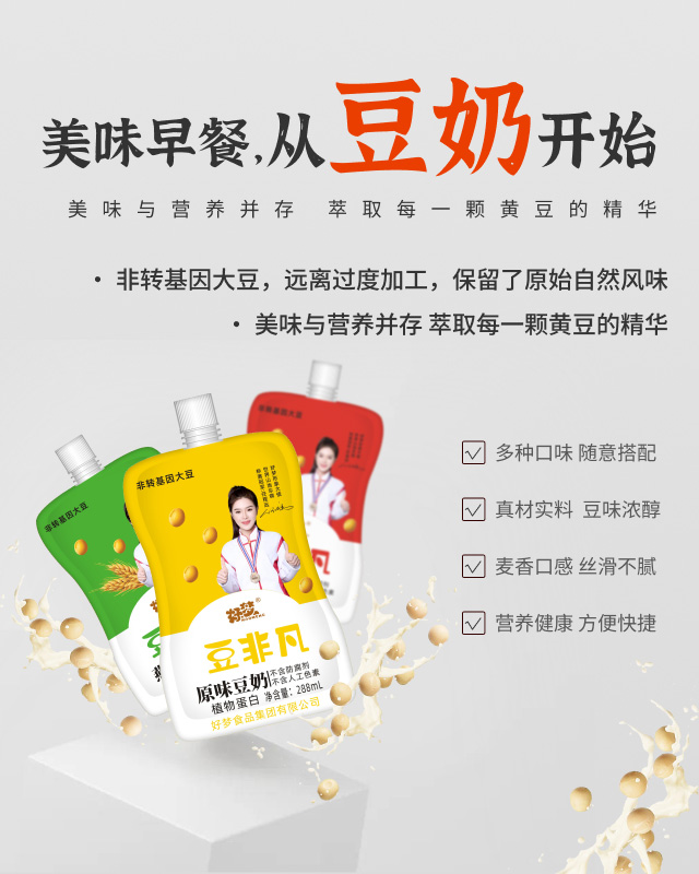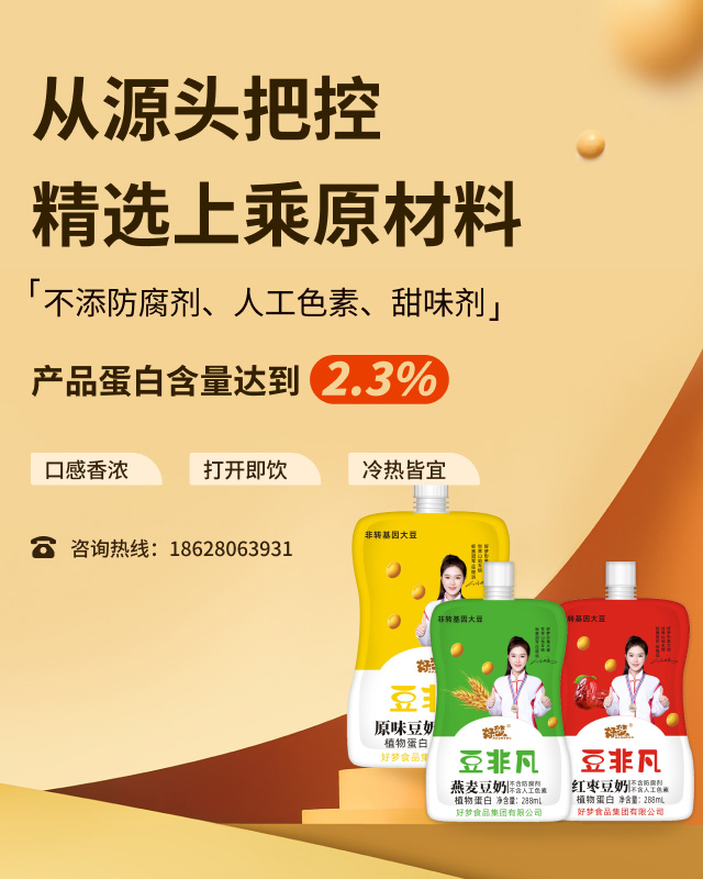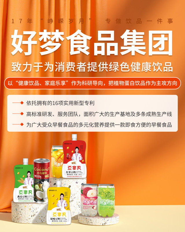 好梦食品集团有限公司是一家四川中小型科技型企业,迄今已经创立17年有余,多年来,它只坚持做饮品一件事,以“健康饮品、家庭乐享”作为科研导向,把植物蛋白饮品作为主攻方向,以研发、生产团队为核心,规模生产基地为基础,创新研发了“豆非凡”系列产品,以此为基础,致力于为广大受众早餐食品的多元化营养提供一款即食方便的早餐食品。